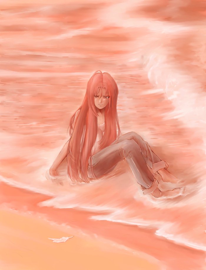 私の中に残った晴子の未練は、まさにこの形でした。思うまま描いて、思った以上の内容ができた不思議な絵です。上記の解説も、あとから適当に書いています。 海に浸る晴子、陸に降り落ちた羽根、なにか象徴的な意味があるのでしょうか。私にも、潜在的なところはわかりません。