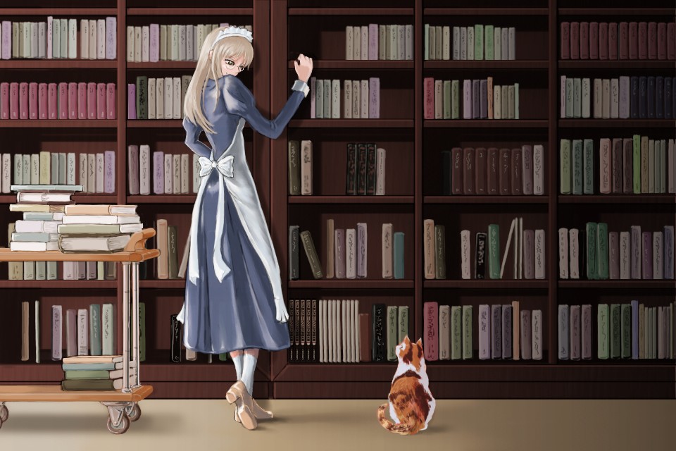 ところで絵の構図を考えていたとき、棚に向かうメイドさんを描こうと思っても、ほぼ完全な真後ろ姿しか浮かばないことに気がついた。彼女を振り向かせるための「客」として猫を出してみたわけだが、この猫という生き物はこういう絵の要素として実に使いやすいことに驚かされる。人物はこころを許し、また猫は超然としているのがいい。わたしが以前勤めていた書店店舗にはたまに猫が入ってきたものだが(自動ドアで侵入が容易であること、飲食・食品関係だとすぐ追い払われるせいか、冷暖房目当てでの書店というのは、野良猫の居場所としてはアリかも)、やはりふつう図書室に猫はいねえだろうと思うがどうだろうか。