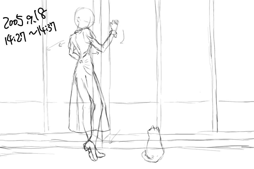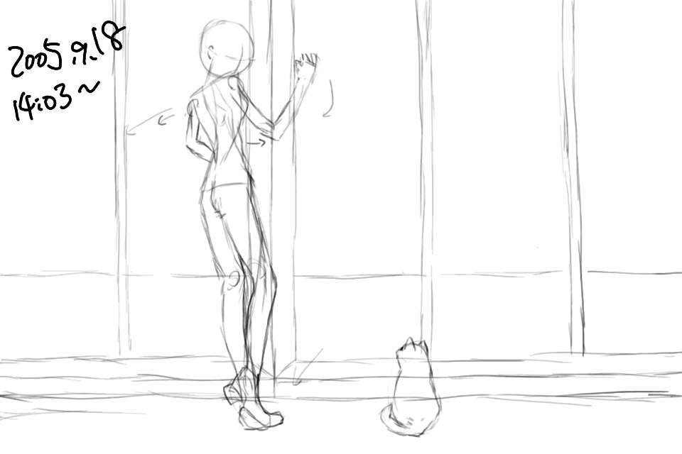 アタリをつけた身体をもとに、そこから布がぶら下がっているように服を描く。具体的にはお尻の頂点なのだが。雰囲気としては、本を整理する作業中に、ふと足元の猫に気がつくといった感じ。でもこのままだと肩で顔がかくれてしまいそうだ。