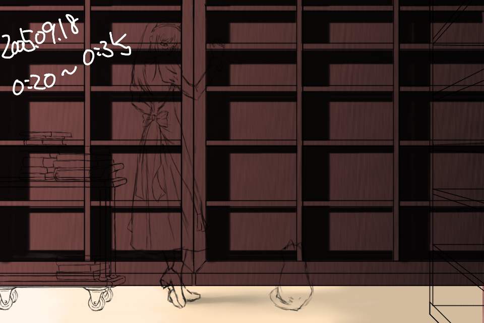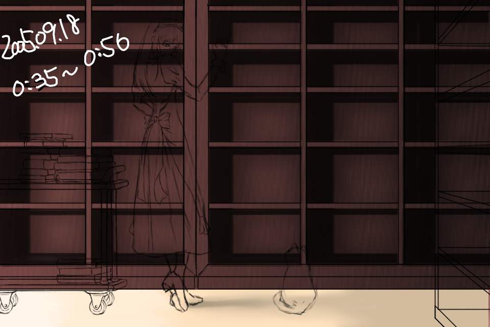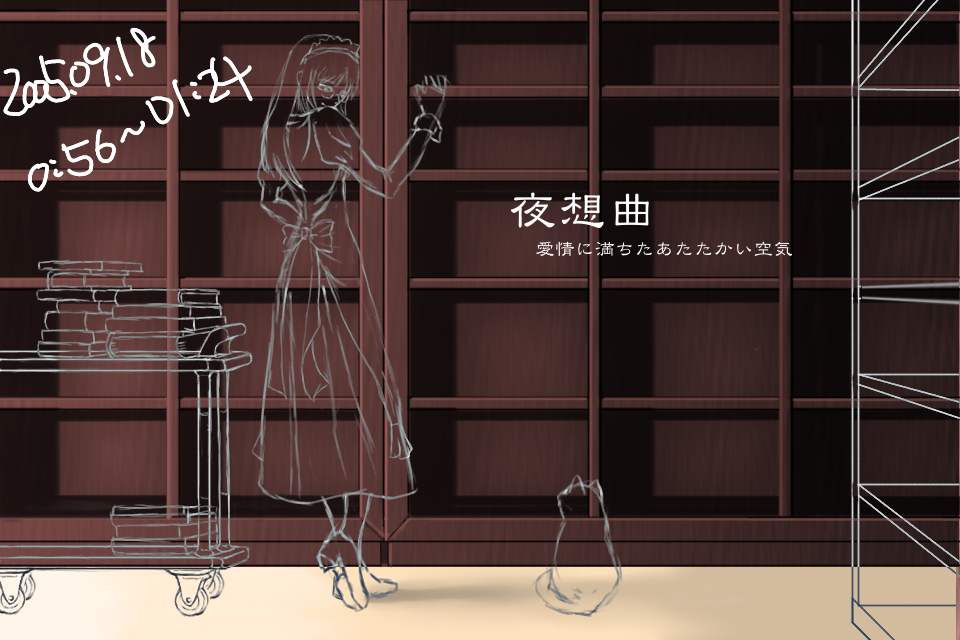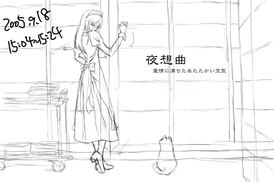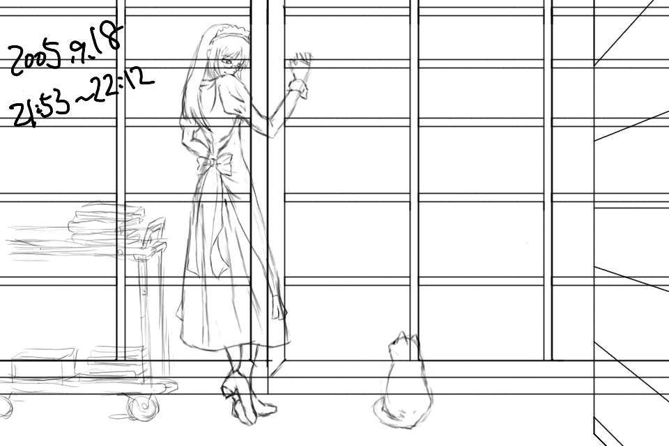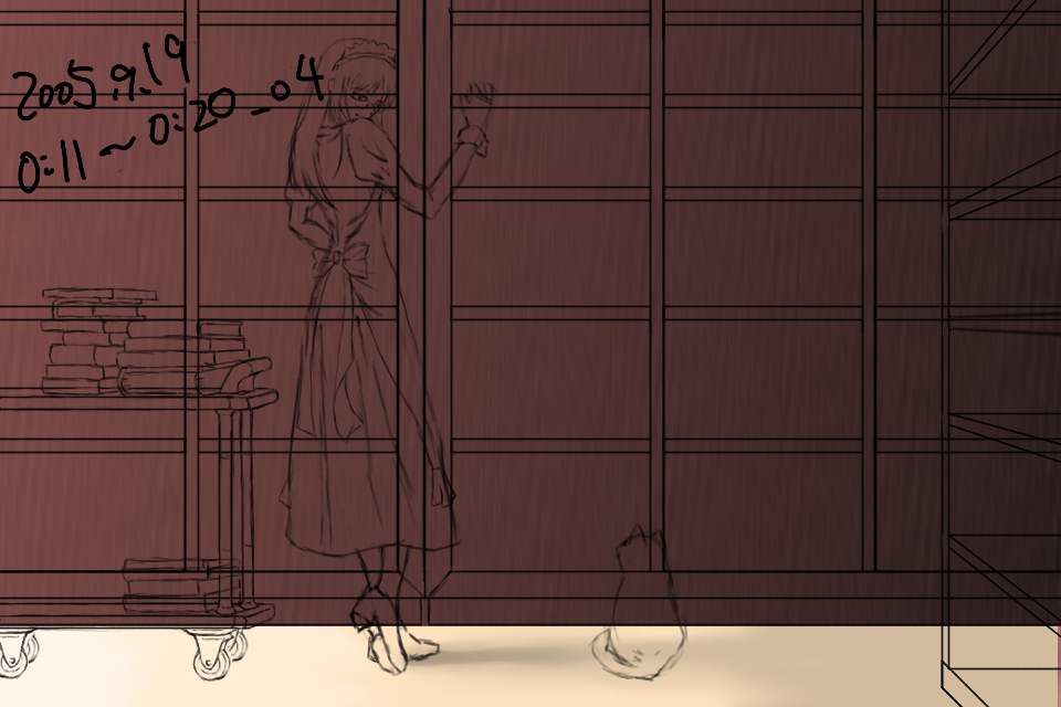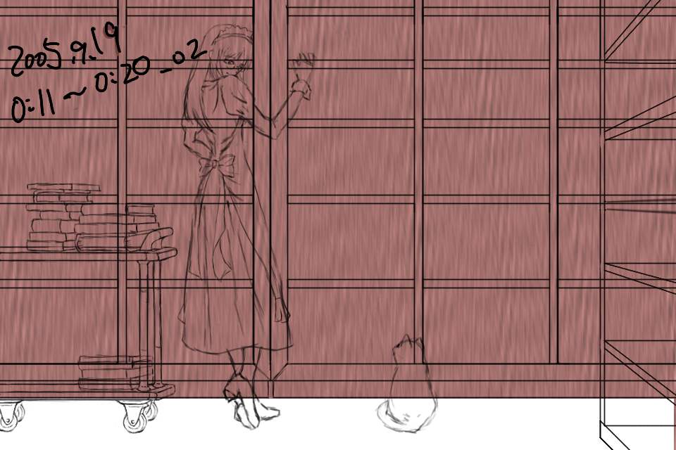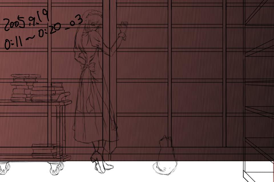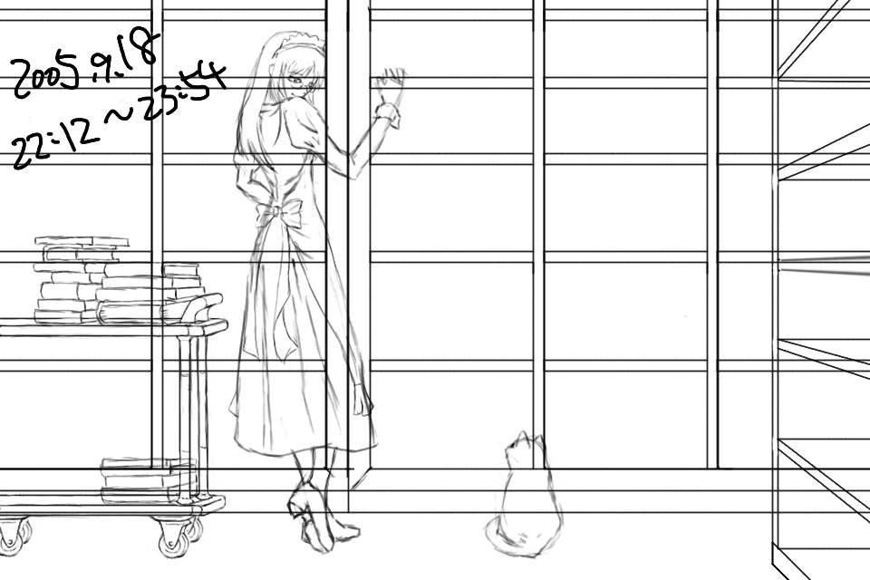 右の書棚のディティールを描く。だが、これは結局けした。ルームワゴンを描いてみるが、パースが適当だったため、これもあとで描き直すことになる。左右の小道具なしでメイドさんと猫だけの絵にしようかとも思ったが、この雰囲気は左右に長い構図でないと出せないと考えた。ただ、それだと左右の余白が寂しいのがジレンマである。しかし今回は細かく保存しているなあ。