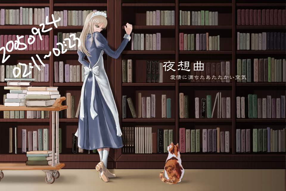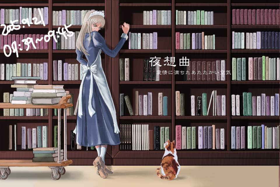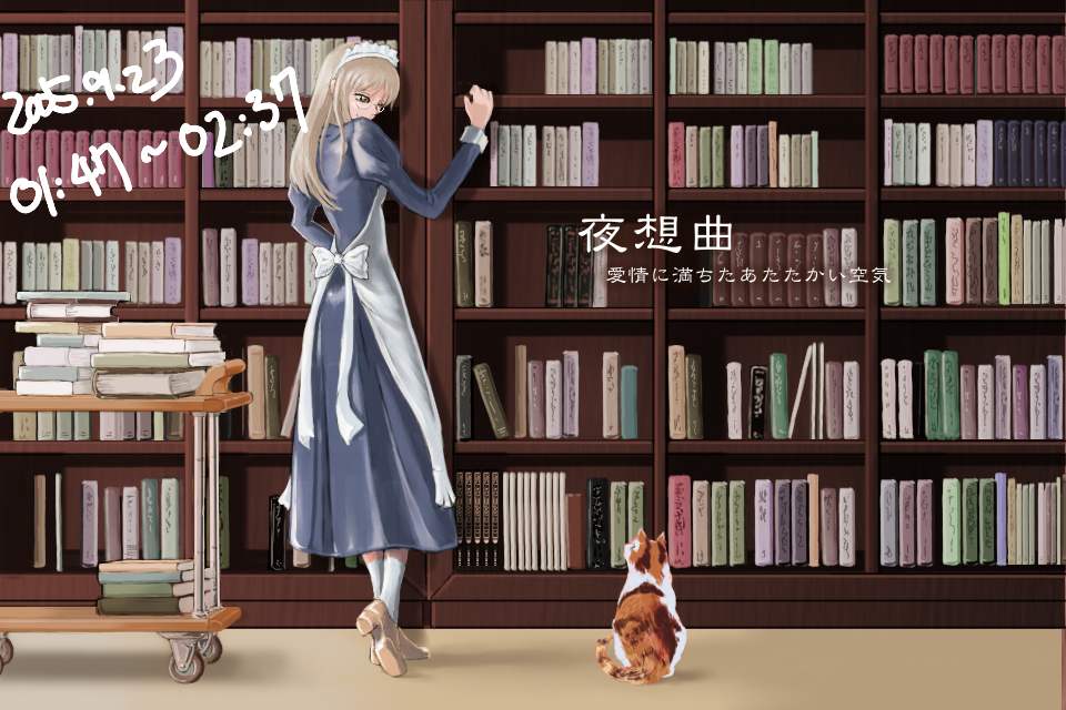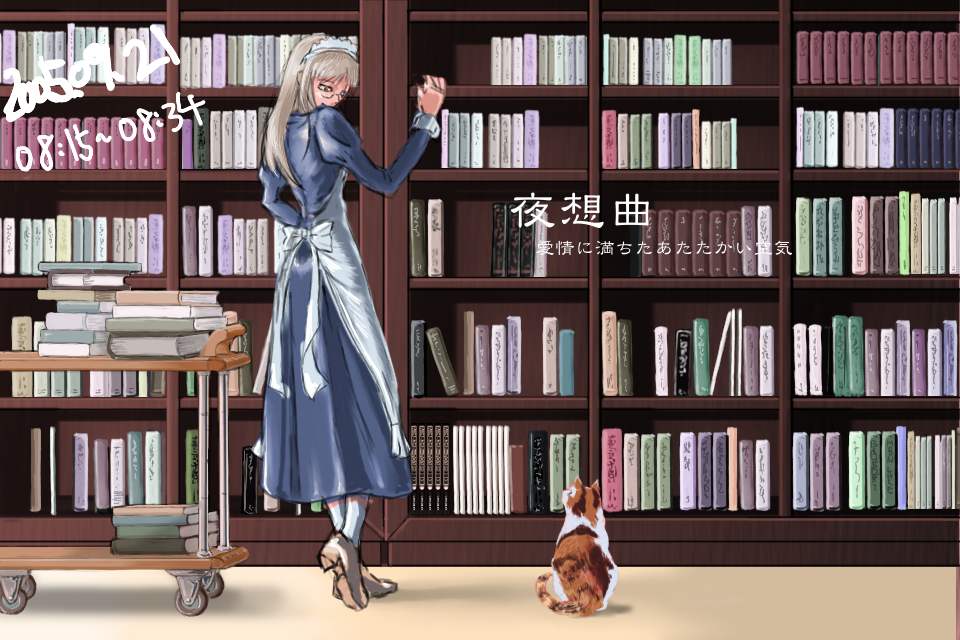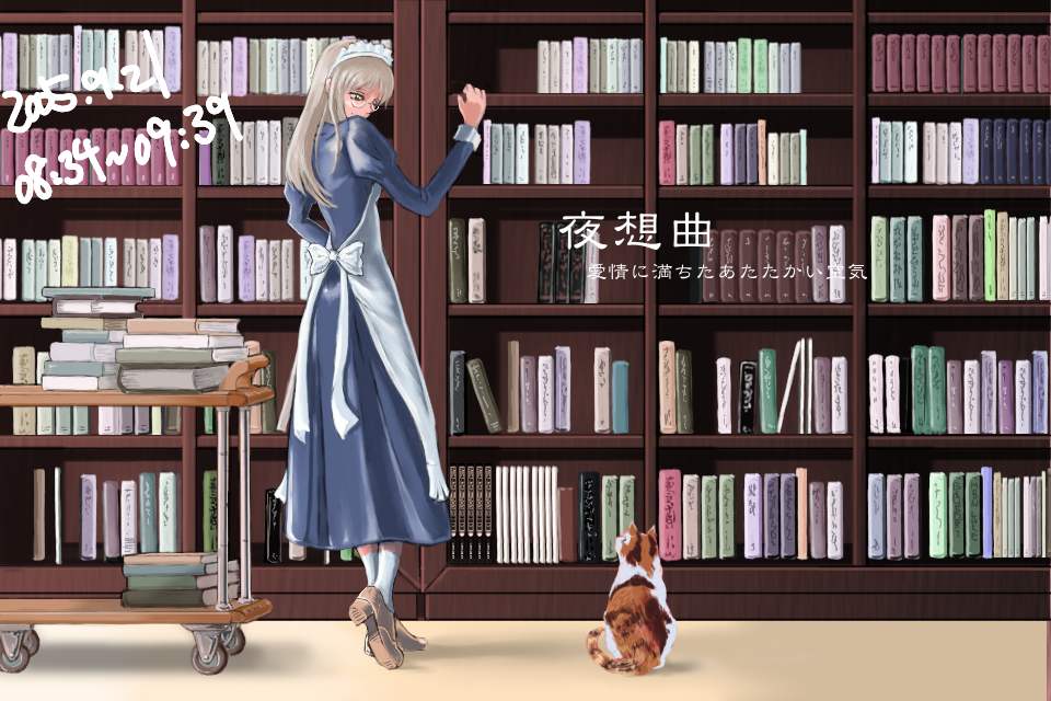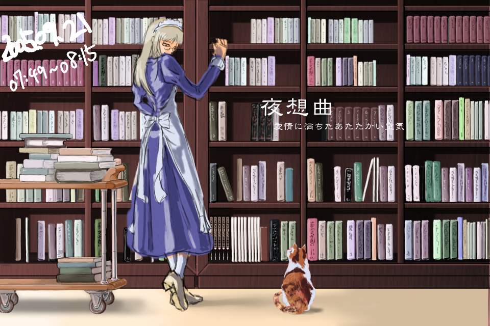 作成日時を記録していたレイヤーを消して完成。タイトルも消したものは一番上にある。書棚がきれいに描けた段階でメイド作画以前に満足してしまったため、メイドというより棚が主役みたいな絵になっているのが失敗だ。あと、それ以前にこうして完成品をみると、図書室に猫がいるというシチュエーションはやはり変だと思う。