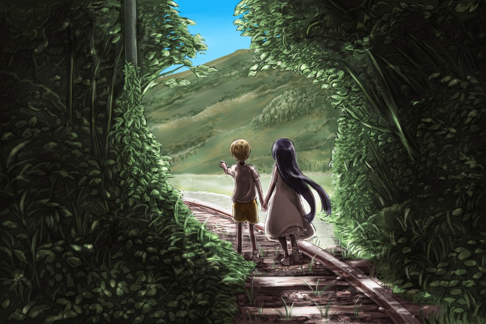 レールに沿って少年と少女が歩いている。