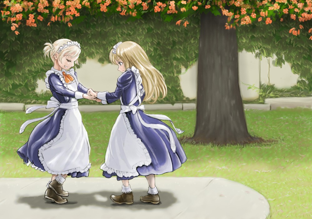 使用人だけでのダンパがたまにあって、その席で一度恥をかいたことのあるメイド(右)が、休み時間に、先輩のメイド(左、でも歳はあまり変わらない)に教えを乞う、という一枚。