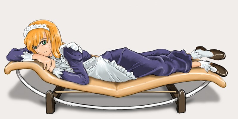 iPODシャッフルを購入したはいいが、自前の環境ではどうやっても使えなかったという「独り言以外の何か(仮)」の管理人:Su氏が、面白いネタを送ってくれた人にコレをプレゼント! としてはじめた企画に、サイトでも度々紹介されていた「夜想曲」の天野が「トップページ用の絵を作成することに関しての最優先リクエスト権」を出品。最終的にはアミダになったものの見事それも突破して、このようなメイドさんが誕生した。