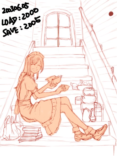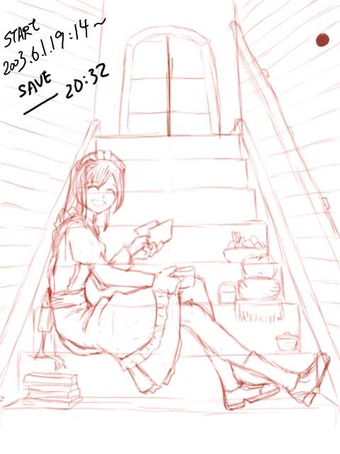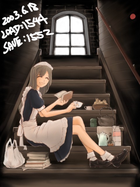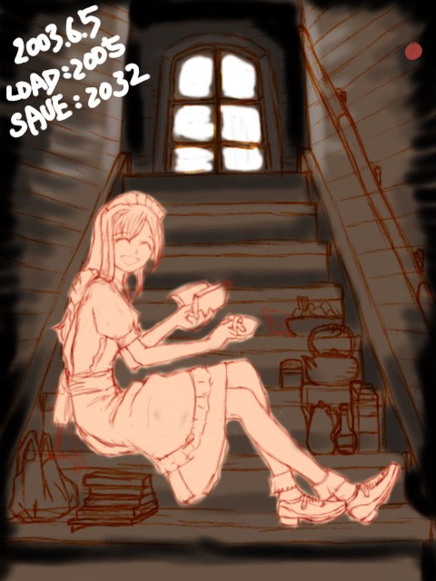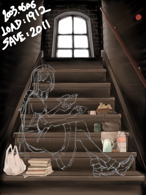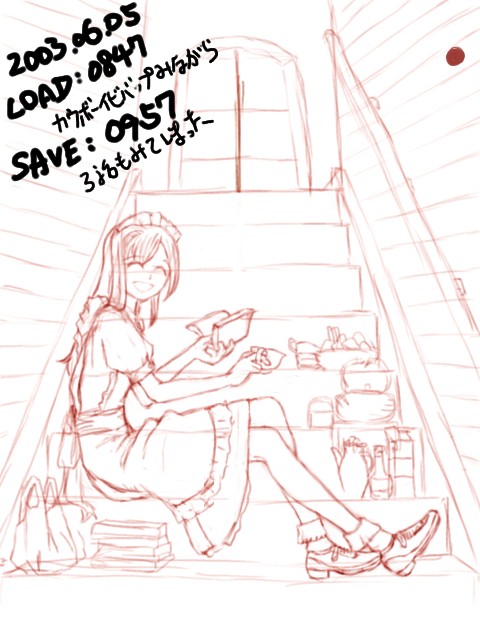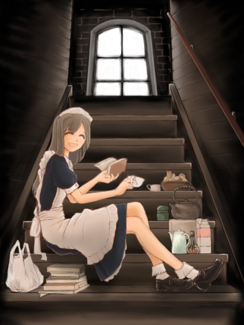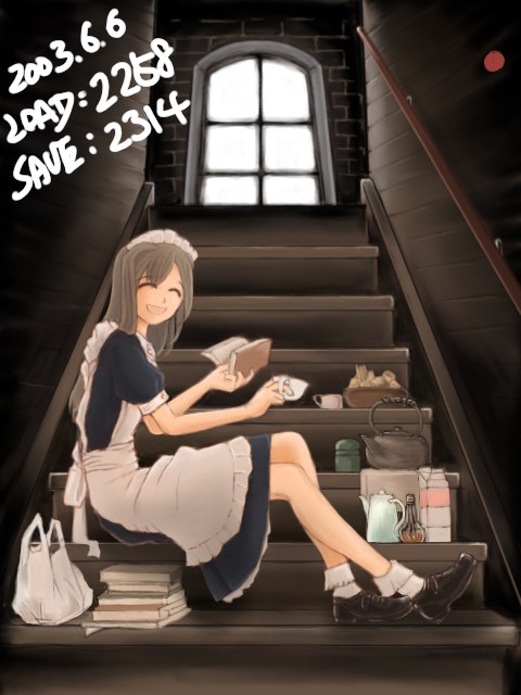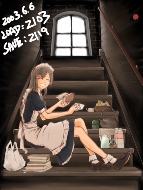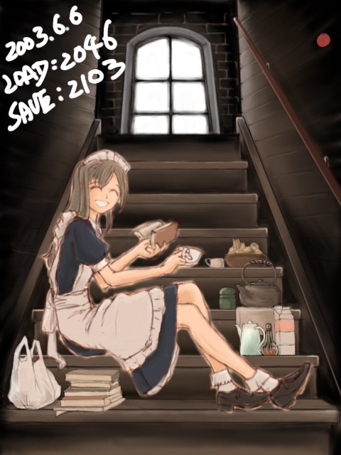 自分でも謎なシチュエーションの絵ですが、お屋敷のあまり人が来ない階段とかを私的に占有して休憩してるメイドさん・・・といったかんじ。鉄瓶があったり茶筒があったり牛乳パックがあったりコンビニ袋があったりなので設定は現代っぽいですが、小道具かく楽しさに流されるままやっつけたので、当方なにも考えておりません。ただメイドさんの表情に罪悪感とかないので、正当な休憩のようです。先輩が見かけて声をかけた場面と考えると