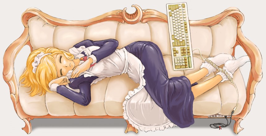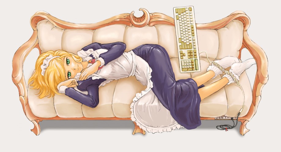 本人のリクエストで、古い98のものを採用したのですが、そのままでは今のPCにはつなげないと思うので、USB変換ケーブルを挿んでみたら、線のつなぎ先が必要なのでなぜかソファに。ただのねそべりメイド絵が、途端に意味不明な絵になりました。こういうときは後付理屈に強い、妄想力のある知人を頼ります。