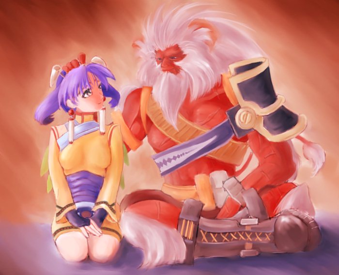 物語は、主人公リュード(剣士)と、ヒロインのエレナ(神官)とミレーニア(悪魔)の関係がメインで終局を迎えてしまったが、個人的にはやはり、絵に描いたマレッグ(獣人)とティオ(ロボット)が良かった。ロアン(王子)は個人的にはどうでもいい。 こういう、ごっつくて強い、無骨だけど実は優しいオヤジと、線のほっそい少女(元気でも無愛想でも可)の関係というのが、もう実にツボ。ハ 最後は、マレッグがティオを引き取って暮らす、という線を夢見ていたのですが、看護婦として生活しているティオの姿の方が、より自立していて物語的にはイイとは思った・・・が、やはりちょっと残念だ。ハ 絵は、マレッグの村で、ふたり席を並べて宴をながめている様子である。 「わしには家族がいなかったが、ティオ、お前のことは娘のように思っておった」ハ という感じの絵になった。ハ 製作環境:PowerMac G4 450・WACOM FAVO・Painter4.0・PhotoDeluxe1.0 マレッグのイメージは、ほんとうに人間山脈な感じで、下手をするとただの背景になりそうなくらいゴツゴツしてます。資料を見ると身長193センチとのこと。でも、素直に身長5メートルとか書いてもらっても、まっっったく違和感がないくらいの存在感です。このヒトにどつかれたら、たいがいの生命体は一発で沈むような剛力、というより質量自体が武器という感じです。 ティオとの対比を考えて、絵では設定程度の身長に描きました。 で、ティオのポーズを「正座してる絵」と決めたあたりから、もうそれを描きたいという気持ちがドンドン高まって、最終的にマレッグ好きを凌駕してしまい、投入のバランスが狂った感じがあります。 かっこいいオヤジの絵が描きたい、と常々おもっていたのですが、やはり野郎はきれいな少女には負けますな! オヤジを描き慣れていないせいもありますが、この絵のポイントは、やはり正座しているティオそのものです。