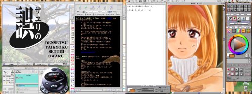 MP3プレイヤーでKanonの初回サントラを聴きつつ、バーチャルPCで「サユリの誤」やりながら、ICQとYahooメッセンジャーで諸兄と語らう一方で、ペインターであゆの絵を描く手を休めて、ネットスケープでチャットしつつ夜想曲掲示板への書き込みを考えながら、シンプルテキストで文章を練っている時の様子。これをこなすマシンパワーも頼もしいが、無闇に広いデスクトップもありがたい。