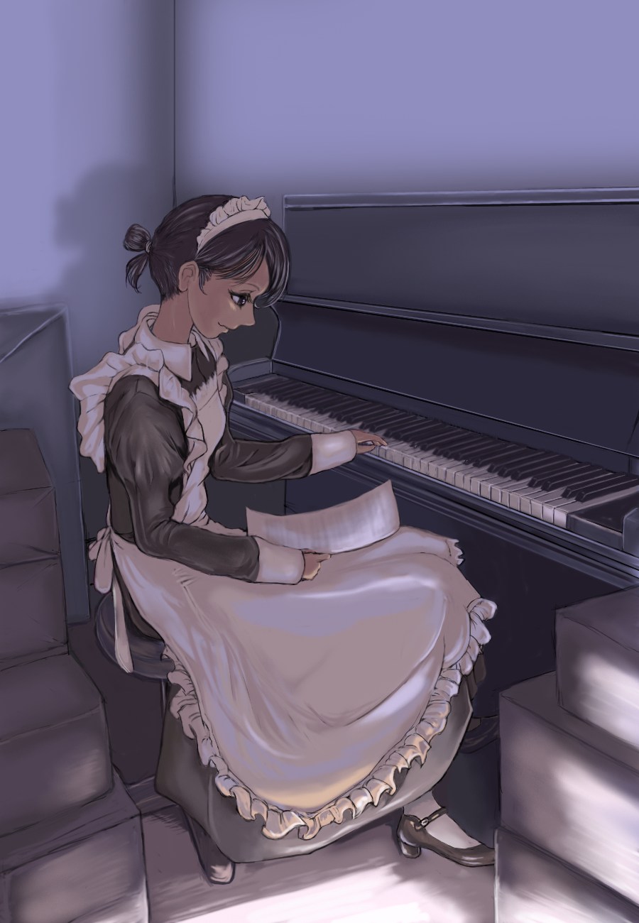 ピアノ (finished:2007.05.29) (upload:2007.06.03) 納戸にあった古いピアノ。 こっそりと弾いてみた。 まだ、手が憶えていた。 ただ突っ立ってるだけのメイドさんを描いてはいけないような、変な強迫観念があってでてきた絵です。 納戸の暗いイメージを描こうと、画面のほとんどを暗色に。入口から足元に明かりが射し込んでいるわけですが、これが分かりにくい。 足元をもうちょっと広く、つまり手前の空間をとってもっと縦長の構成にしておけばよかった。