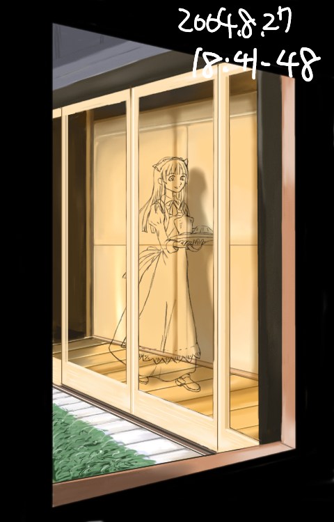 所要時間:11分窓ガラスの下の方に光沢を描く。これでメイドさんがガラスの向こうにいる雰囲気に。音が遮断されている感じをだしたかった。本当はガラス全体に効果をつけられるといいのだが、メイドさんが隠れるのを嫌っている。