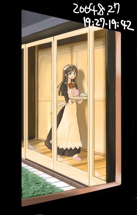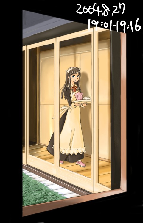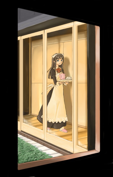 「まどあかり」 「階段メイド」 につづく黒背景メイド絵の第三弾ですが、これ毎年夏に描いてることにさっき気がつきました。いや、だからどうしたというわけでもないのですが、毎年へたすると半年ちかく放置されているのが夜想曲のトップページ用絵であるにもかかわらず、今年は同人誌の宣伝もあり、早々に退散した思い出薄い一品です。