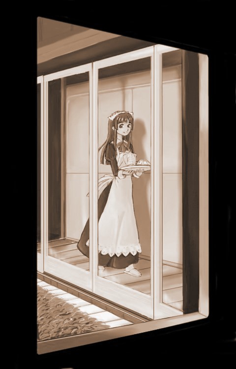 はなれにある御主人様の書斎か、あるいは中庭をはさんだ仕事部屋に、お茶をはこぶメイドさん。