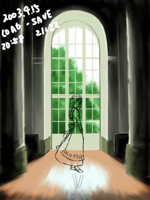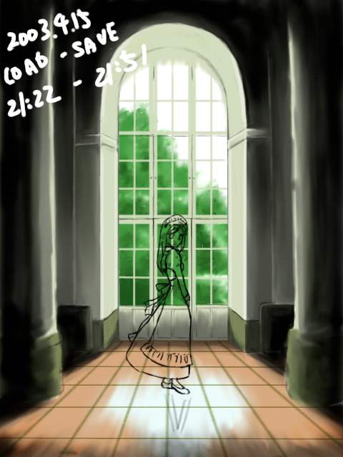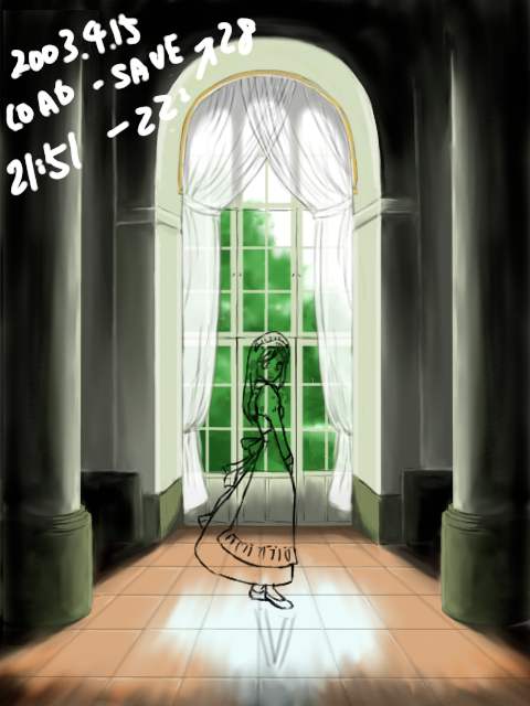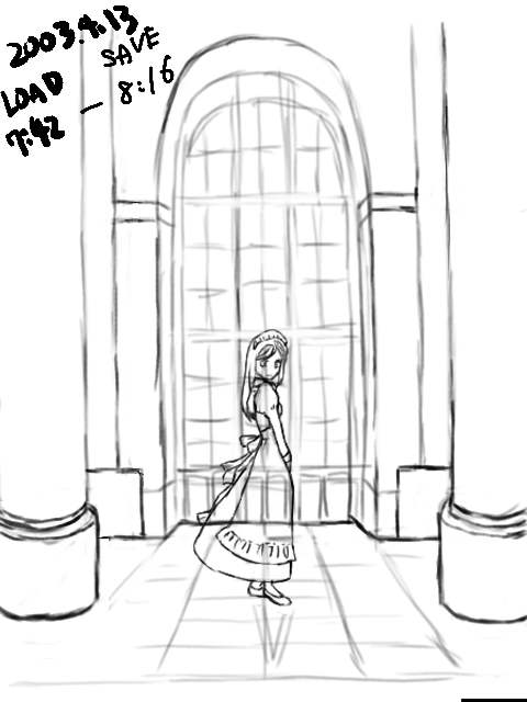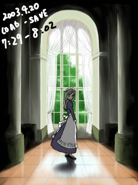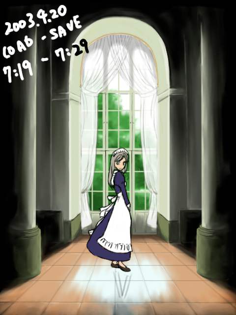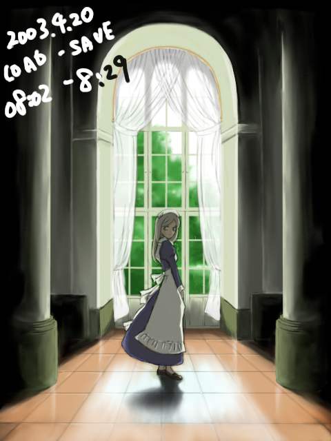 人物を清書。いちど「メイドさんがいいかも」と思ってしまったら、他の何でもそれに優るものは無いような気になってしまったので、このような形に。まあ、この背景で巫女さん描くわけにもいかないのでやむなし。