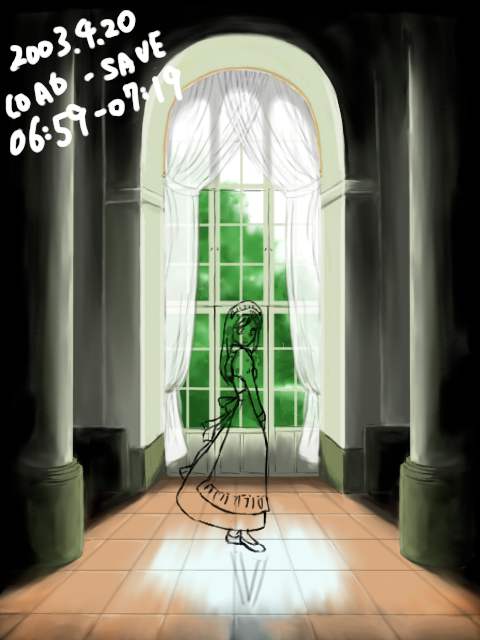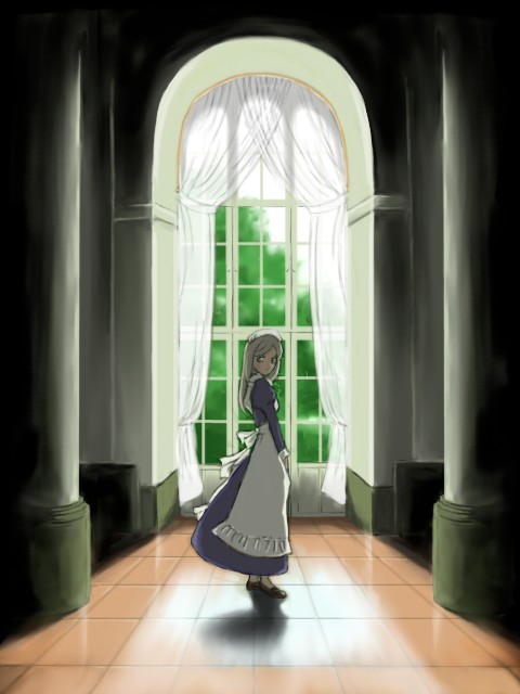 天使のときも、引越のときもそうでしたが、黒背景に上手く溶ける絵を描こうと考え、こういう構図を選びました。まどあかりの中に立つ影は別に誰でもよかったのですが、お屋敷然とした窓の前にいちばんしっくりくるのは、やはり、こう、メイドさんだろうと!(握り拳で) 困ったときは自分にやさしくメイドさんでいいだろうと!(机をたたいて) でも、この易きに流れる決定のせいで、この次のトップ用の絵もなし崩し的にメイドさんになってしまいました。これでよかったのか未だに分かりませんけど。