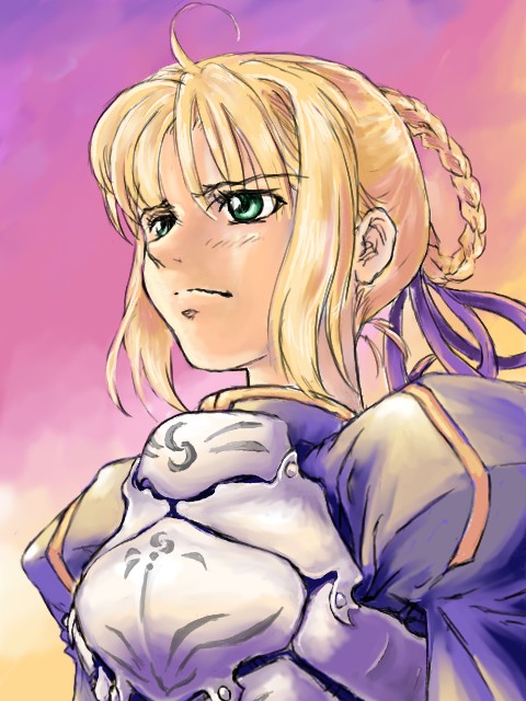 騎士王としてのセイバーを描いている公式の絵がいくつかある。風に流れる雲を背景に、逆さに立てた剣の柄に両手を添え、彼方をみているセイバーの姿は、オープニングやデモ映像でよく目にする代表的なものだ。これが一番近い印象ではあるが、かの絵はセイバーの表情がスッキリしすぎている。これがどうしても違うと思えてならなかった。