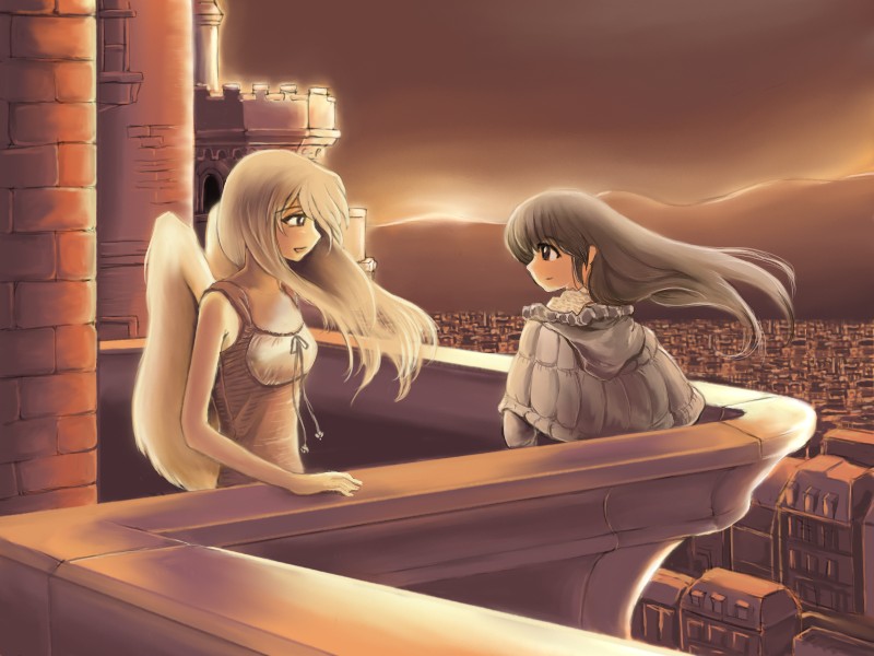 王城の目立たない回廊で、英雄となった天使と、若き女王が、誰にも話せない胸の内を語り合っている。