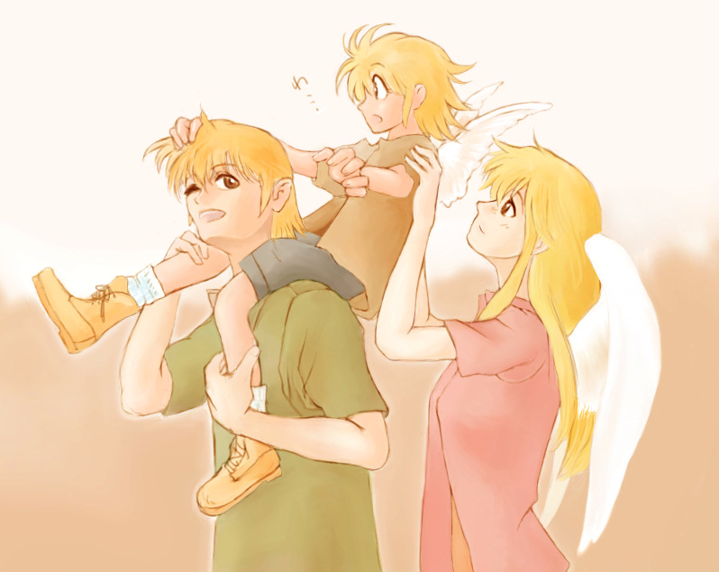 最初こまったのはライエルとサイザーの服の色でした。もうワンパターンなのですが、ライエルのパーソナルカラーはグリーン、サイザーは赤です。でもそれをモロに描くと、この絵の雰囲気ではなくなってしまうのです。そんなわけでこれもワンパですが水彩で薄茶を被せました。色が誤魔化せたところで、全体のトーンも薄茶で統一します。 この世界は、魔族との最後の決戦から、10年後のさらに数年後です。いちおうオカリナ8才くらいにみえるので18年後ですか。 ライエルを描くのは、いったいいつ以来でしょう・・・。結婚して子供もできて、たくましく成長したパパとして描いてみました。ピアノ弾きだからでもありませんが、彼の手は意図的に大きく描いています。腕もたくましく。 サイザーは、幸せの中ですっかり落ち着いた雰囲気を。怒るとそれはもうはいあの恐いのですが普段はキレイで優しいお母さんです。 オカリナは、ボーイッシュになってしまいましたが、これはこれでまあ善し。ああ、でもこの子は学校で、羽根のことでいじめられたり、お母さんの悪口言われて、泣きながらケンカしそうな気がします。でも戦闘能力が母親譲りなので、かるく撫でただけでも相手は半死か。 ハーメルんとこの、強烈ないとこ連中に可愛がられて、あとワルキューレに色々吹き込まれながら育つのでしょうね。