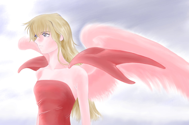 今回は、服も羽根も肩当ても、赤を基調にし、肌もピンクっぽいです。