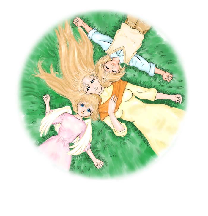スカートの裾をおさえて、パンドラが腰を下ろす。 「きもちいいわよー」 気持ちよさそうな声でパンドラが呼ぶ。 「ハーメル、サイザー、あなたたちも寝転がってみなさいよー」 すぐにハーメルがパンドラに頭をならべる。まだ短い手足をいっぱいに伸ばして大の字になった。