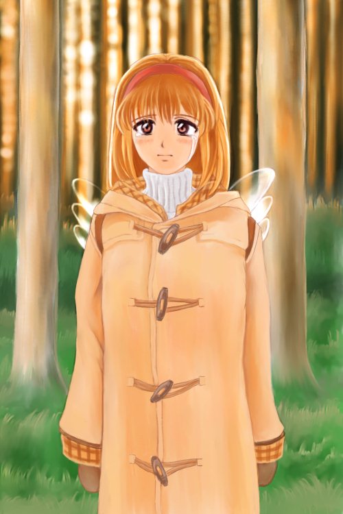 製作環境:PowerMac G4 450・WACOM FAVO・Painter4.0さて、二枚目になるあゆですが、一枚目のとき「おとなっぽすぎる」という指摘があったので、意図的に子供っぽくしました。いや、単に丸顔なだけですが。しかし、表情がどうやってもあゆにならず、かなり苦戦しました。私には、特徴がつかみづらい絵です。
