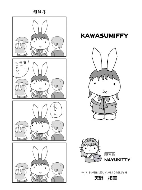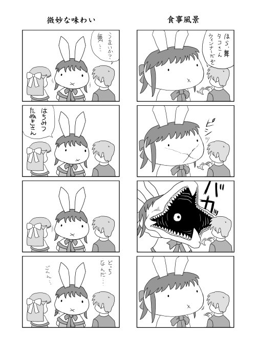 どこで思いついたのかすでに記憶に無いのですが、ミッフィの口が四方に展開するというよくあるネタだけで四コマになりました。 「食事風景」の寄生獣みたいな舞を見ても分かると思いますが、本来の目は口内にあって、あの愛くるしいちいさな目は、義眼なわけですね。あまり考えたくないですが。