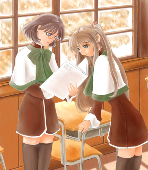 あえて筋を通すなら、この絵は、美汐が通っていた木造校舎の小学校に2人で潜り込んで、彼女がむかし読んだこの地方の昔話、とりわけ「ものみの丘の妖狐」の話を語って聞かせている場面でしょうか。
