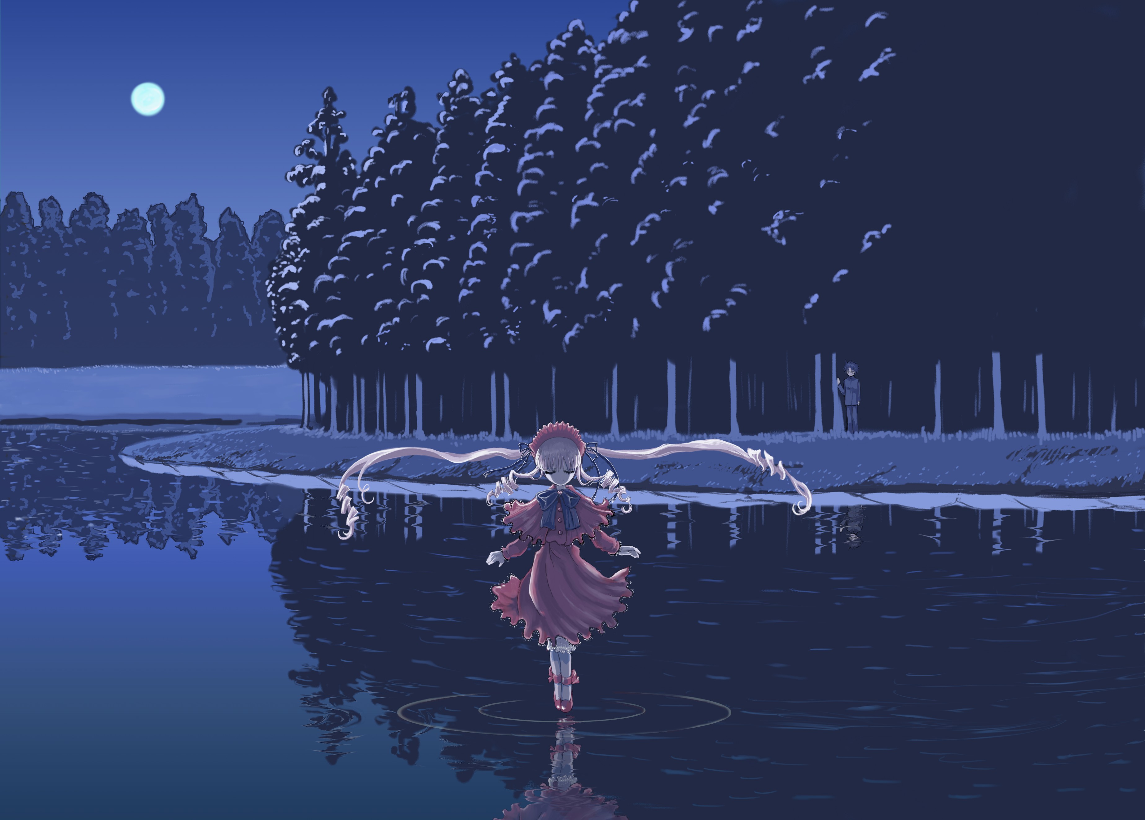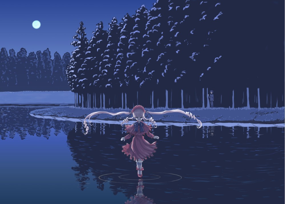 実際に本として印刷されたレイアウトはこちら。絵的には、真紅が左に寄ることで、右側にひろがる湖のスケール感といいますか、その深さが感じられると思います。モニターだと分かりにくいですが、印刷された同人誌を表裏をあわせてみるとイイ感じです。いや2冊ならべるのはスタッフでもないと無理か。でもモニタではなく実体でみると感慨が違うので、とりあえずJPEGの原寸データを参考までに(1・2・3) どれも700KB以上あるので注意を。構図としてはどちらのバージョンも不完全ですが、最初におもいついたこともあり、左寄りの方が好き。