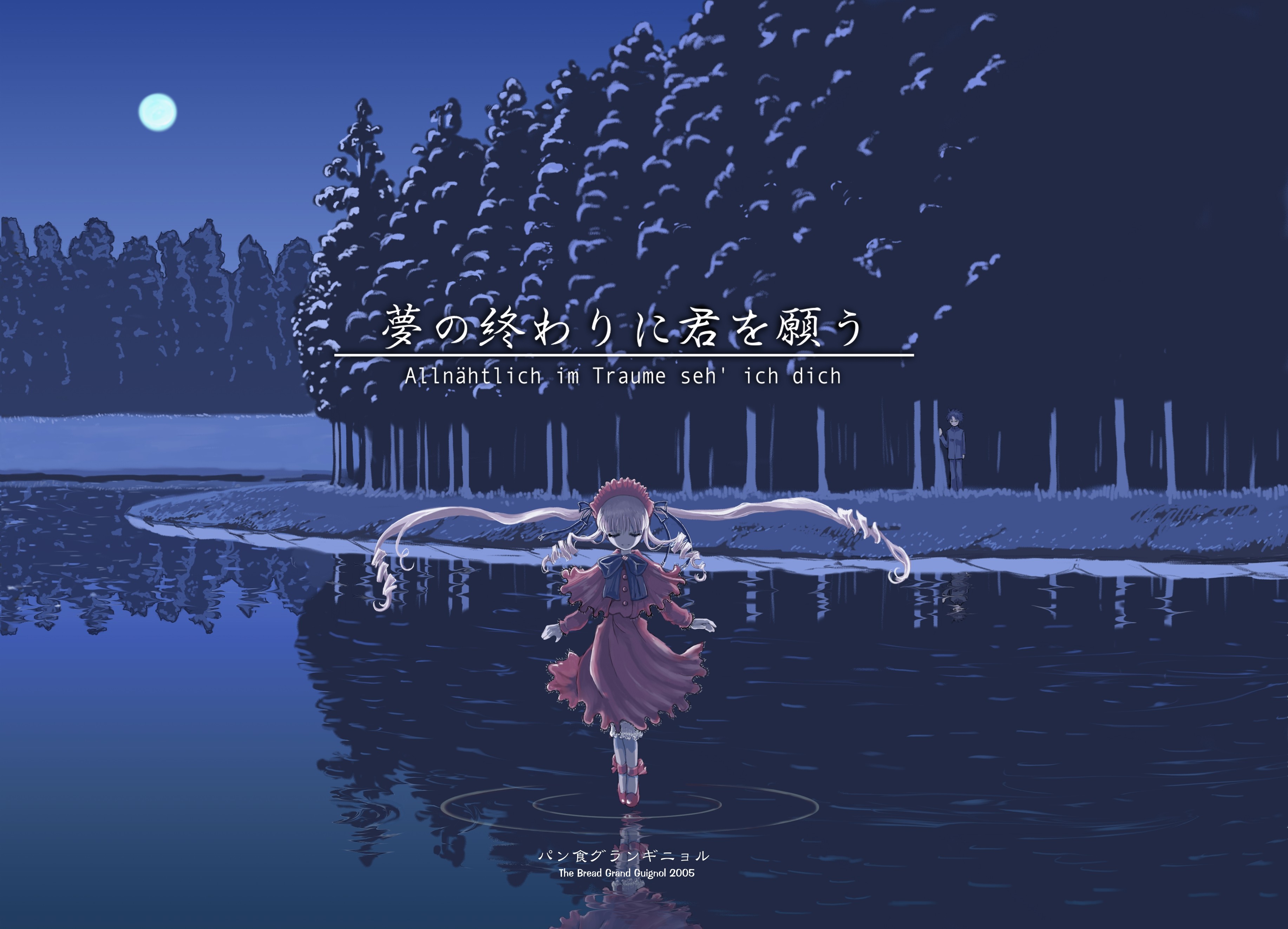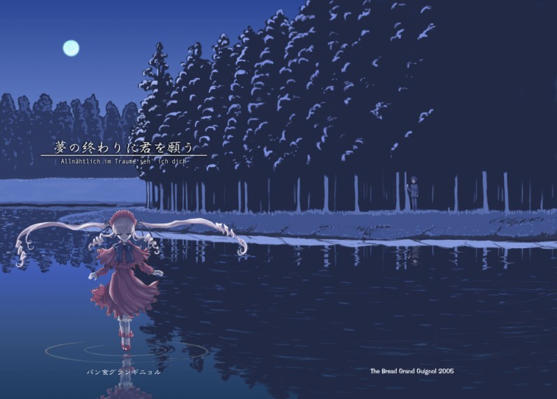 ロゴに英・邦の両題を付けるのはいつもの癖でもありますが、邦題だけでは寂しく思えるのと、ふたつのテーマを表現できる方法でもあるので好んで使います。今回もそんな風に使えればよかったんですが、この時点でまだ同人誌の小説部分は完成しておらず、原稿内容がわからない状態だったので、これ以上ひねるのもどうかと思い、せめて奇をてらおうと見慣れない、しかしローゼンメイデンの第一外国語であるドイツ語にしてあります。ちなみに副題につけたこの「Allnahtlich im Traume seh' ich dich 」は、「夜ごとに夢の中で私は君を見る」の意。
