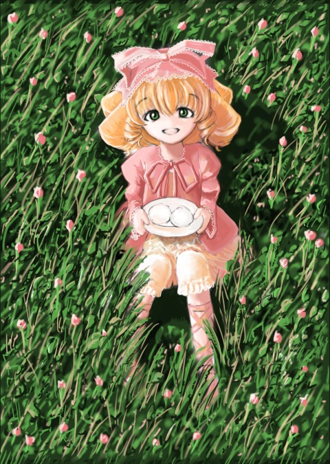 「こっち、座ってなの」草花に埋もれた雛苺が、左のよこちょをぺんぺん叩く。