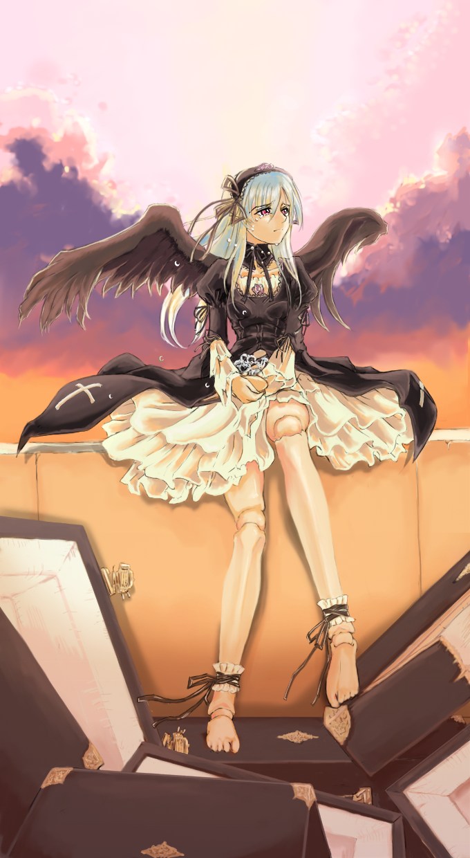 なぜ蔵に入っていたかは、このドールらしからぬプロポーションのため。少女の体格という解釈で「アリスに成れた水銀燈」として描き直してもよかったのかもしれませんが、わざわざブーツを脱がして球体関節も露わに描いたこの脚が惜しかったので、そのまま仕上げました。