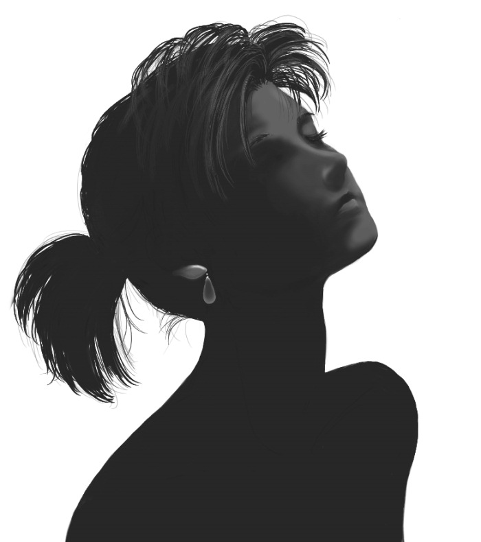金属と肌の異質感を出すために、モノトーンで黒くツブしました。 最初は、何色のトーンにしようか迷って、イヤリング本来の赤とか髪の色でミドリとか試しましたが、結局ブルーグレーになりました。表情のせいですね。