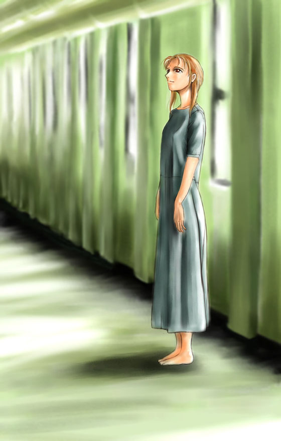 遠近法で窓と窓枠と柱をならべて、床に陽光を落とし、天井にパイプを走らせました。あとはフォーカスをソフトにして、合成します。