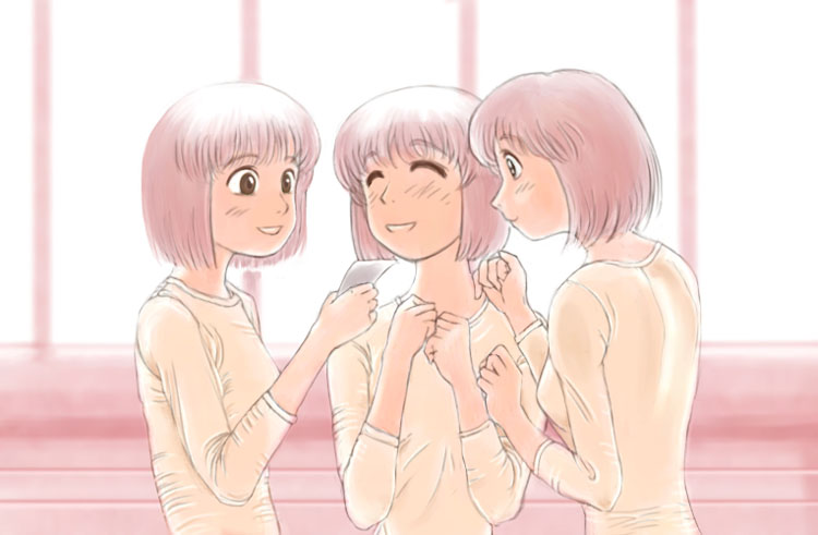 オーナーが決まる日。 制作環境:Macintosh Performa 5440(88MB)・Painter4.0・WacomArtPad2 普及型の(ってなんかこだわるな、おい)ロボットの研修所というと、おそらくはもう決まり切った課程をすすめる施設として確立されているような気がするので(masterpieceさんからの文中の設定とは、違いますが)着ているものは、なんというか、ださださのシンプルなものであろうと考えました。まあプライベートなシーンなので、ルームメイトの三人が、下着姿で談笑しているのだとも考え、こんな感じに。